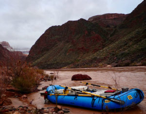 Dans le rapide suivant, Éric se met une boite dans un rouleau et, ne parvenant pas à esquimauter avec son Itiwit, il nage. Julien le récupère et Loïc ramasse son bateau. Après toutes ces péripéties, nous entrons dans des gorges granitiques. Changement de décor, mais aussi de météo. Les nuages arrivent, accompagnés d’un vent glacial et de pluie. C’est le Mordor, on se les pèle grave. Penda sort même la couverture de survie sur le raft pour essayer de se réchauffer. On décide de ne pas manger et de descendre le plus vite possible pour monter le camp et faire du feu. Jakob, Éric, Bastien, Cédric, Arnaud et moi faisons une pause à Phantom Ranch pour envoyer une carte postale qui sera acheminée par mule depuis le fond du Canyon. On se gèle vraiment. Éric et Jakob montent les poster au village et prévenir les rangers que tout va bien, au cas où ils auraient eu vent de l’histoire du matin.