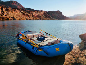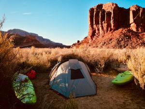 Au matin, nous avons plié le camp dans le même froid que lors de notre arrivée de la veille. Cette nuit, la neige est tombée à 1000m, soit juste au-dessus de nous. Au programme 10 miles, soit une petite journée, avec 1 rapide classé 4 et 2 rapides classés 6, le reste sera plat mais avec du courant. Nous avalons ces miles rapidement puis montons le camp. L’après-midi est prévu pour nous permettre de nous reposer. Hélas, il pleut. Loïc et Éric sont partis marcher. Bastien bouquine dans sa tente. Certains jouent aux cartes, d’autres se reposent, moi je me balade et j’écris ces quelques lignes depuis un caillou bordé de cactus placé au sommet d’une dune surplombant le camp. À ma gauche, des falaises enneigées. À ma droite, des reliefs ocres. Nous sommes en amont d’un rapide (classé 6) que nous avons été repérer avec Bastien un peu plus tôt en allant chercher du bois. Cette demi-journée de repos devrait nous faire du bien avant la journée de demain, qui s’annonce comme l’une des plus intenses avec environ 10 rapides dont de nombreux classés 6, 7 et 8. Nos mains et nos visages sont asséchés par le froid, mais la météo devrait s’améliorer dès demain midi. Comme tous les jours depuis le départ, j’allume mon téléphone en quête de réseau pour pouvoir donner des nouvelles à Marie, mais je ne capte toujours aucun signal. J’espère que la transmission de pensées fonctionne…