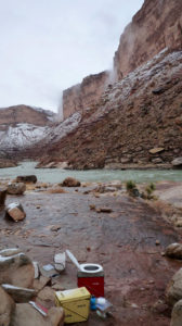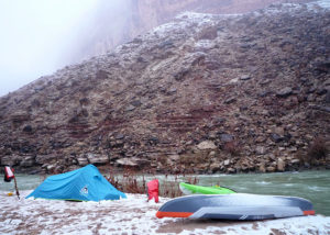Petit déjeuner sous le tarp, couverts comme des oignons, nous regroupons nos forces pour la journée qui s’annonce. Le pliage du camp et le chargement des bateaux sous la tempête nous mettent directement dans l’ambiance ! Nous embarquons sous des flocons de plus en plus gros et plus collants. Le vent vient de face, on n’y voit rien et la neige nous fouette les yeux ! Heureusement, la rivière est encore calme. Puis, alors que le temps s’apaise, la voici qui s’accélère ! Les Esprits du Grand Canyon sont avec nous ! Un premier rapide (classé 5) avec de grosses vagues passe plutôt bien. De toute façon, vu le froid, on essaie autant que possible de passer à côté des trous. Plus loin, le passage de niveau 7. On s’arrête pour repérer. Il y a un gros drossage à gauche avec deux énormes trous où il vaut mieux ne pas tomber. C’est gros, il y a du volume et de la puissance… On se sent tout petits mais en coupant le virage à l’intérieur, ça passe plutôt bien.