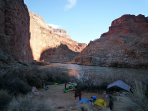 Aujourd’hui, nous partons pour 20 miles avec seulement 2 rapides (classés 4). Le reste ne sera que du plat au cœur de falaises magiques. Le Canyon est profond, des chutes (sèches à cette période) semblent tomber dans d’énormes cirques lorsqu’elles sont en eau. Avec Loïc et Bastien, nous débarquons pour aller voir quelque chose qui ressemble à l’entrée d’une mine : un trou d’environ 2m de diamètre taillé plus haut sur la berge. Une fois devant, nous découvrons de vieux outils (un niveau à bulle, un seau et du fil). Nous décidons d’entrer. À l’intérieur, dès les premiers pas, nous sentons qu’il fait beaucoup plus chaud que dehors. Nous avançons, nos yeux s’habituent à l’absence de lumière, mais sans lampe de poche et alors que les autres membres de l’équipe continuent de descendre, il n’est pas possible d’aller plus loin. Après avoir regardé dans le topo-guide, nous apprenons que ce sont d’anciens forages, qui avaient été effectués afin de voir si la roche supporterait un barrage à cet endroit. Un peu plus loin, nous rejoignons le groupe pour un pique-nique plutôt rapide, car la plage passe à l’ombre en quelques minutes. En repartant, nous passons devant un camp avec 4 rafts, mais il n’y a personne. Ses occupants doivent être partis randonner dans les alentours. Il ne nous reste plus que 6 miles pour arriver à notre campement, « dinausor », dont le nom provient de l’immense falaise ressemblant à une tête de dinosaure qui borde une très belle plage. En regardant vers l’autre berge, au loin, on devine autre une montagne qui a également cette forme. Une fois le camp monté, nous faisons un feu. Le ciel est bleu et le coucher de soleil dans le Canyon nous offre des couleurs sublimes dans des tons ocres, le tout réhaussé par une couche de neige blanche. Au menu : hot dogs avec sauce barbecue. J’ai droit à une saucisse végétarienne franchement bizarre… Aujourd’hui, Christian était malade. Ce soir, il va un peu mieux. Claire est malade aussi, elle semble avoir de la fièvre et n’a pas mangé avec nous. Espérons que cela ira mieux pour elle dès demain.