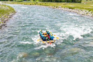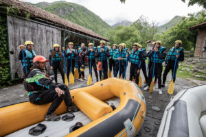 Pour cette après-midi, nous serons accompagnés d’un groupe d’infirmiers et infirmières nous venant tout droit de Pau. Eux aussi ont de l’énergie à revendre, en les voyant arriver on savait que ça n’allait pas être triste ! Tom nous donne les consignes de base, et nous passe à chacun un équipement thermique complet : combinaison, veste, et même chaussettes. L’eau est encore un peu fraîche fin mai, donc on part s’habiller, sans oublier le casque et le gilet de sauvetage. On prend une pagaie et on est partis pour la mise à l’eau du bateau. La rentrée dans l’eau est un peu fraîche. Elle est en dessous des 10°, mais les combis font leur travail et très vite on se réchauffe. On monte sur le raft et en avant ! On est seize en tout, dispersés en deux groupes. Ceux placés à l’avant donnent le rythme et les autres essayent tant bien que mal d’être synchronisés. Ramer peut être assez physique quand on n’a pas l’habitude, heureusement que le courant de la rivière nous aide un peu à avancer… La descente alterne entre passages mouvementés, avec des trous à certains endroits, et d’autres plus calmes. Se mettre devant n’est pas forcément la meilleure idée, c’est souvent là qu’on se mouille le plus quand le raft prend des vagues. Mais bon il faut avouer que c’est quand même très drôle ! On s’arrête au milieu du parcours pour une petite descente sans raft. Je vous explique : on se pose sur la berge et on descend du bateau. On remonte le cours d’eau sur une cinquantaine de mètres et on se jette dedans ! On se met sur le dos et on se laisse emporter par le courant. C’est un peu comme un immense toboggan naturel. On flotte grâce au gilet de sauvetage donc rien à faire à part apprécier la vue. Et elle est grandiose en Vallée des Gaves ! En tout, la descente durera plus d’une heure. Largement le temps de profiter, de se mouiller, et surtout de rigoler ! Pas le temps de s’ennuyer. Quelques chutes du bateau sont à déclarer, principalement dues à l’autre équipage qui, dès qu’ils se rapprochaient assez, faisaient tout pour nous donner un petit bain. Mais au final tout le monde est arrivé à destination et on pouvait lire un grand sourire sur tous les visages. On n’est pas des pros de la rame mais je trouve qu’on s’en est quand même plutôt bien sortis.